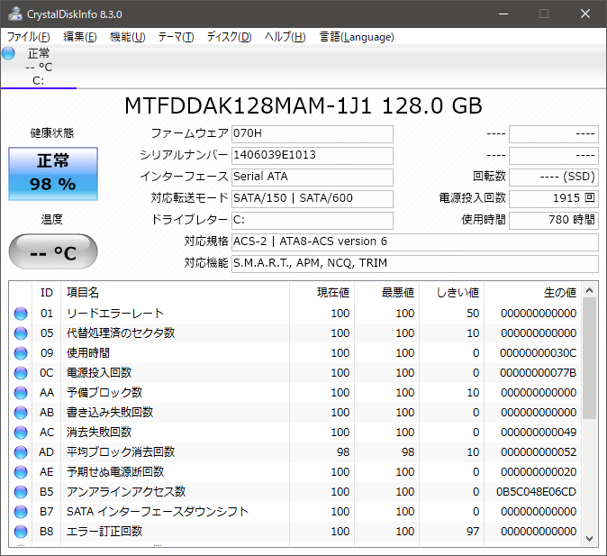 Micron RealSSD C400 (MTFDDAK128MAM-1J1)をThiniPad T520に入れ、Windows10をインストールしてみたところ、T520ではSATAドライバーを何にしても、同様の低い書き込み速度しかでないことが分かった。